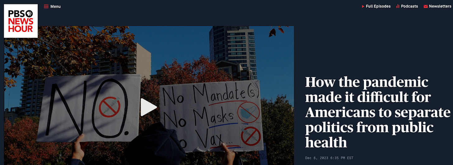 One bright spot is that a PBS reporter did a segment where she discussed the “politicization” of public health and allowed both patients and a physician from the clinic to offer their perspectives and experiences (the physician was Dr. Renata Moon, a colleague I deeply admire and who I testified with at Senator Ron Johnson’s 2nd Opinion Panel). Can check it out here: