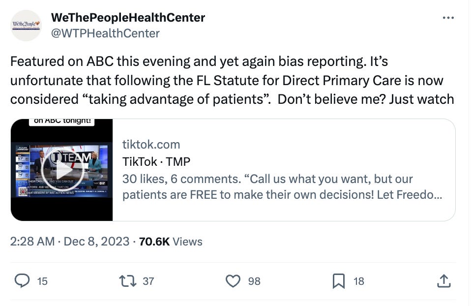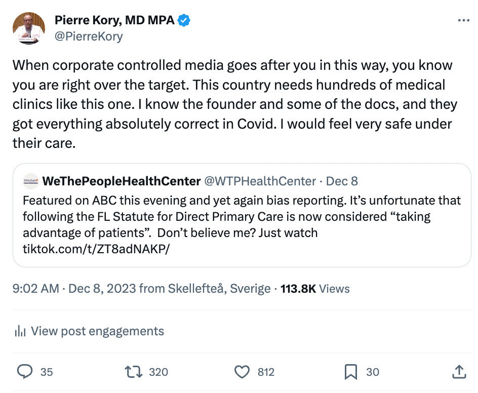 Now, lets get to the hit piece. In September of 2023, Tanya and her partners launched a brand-new medical facility called We The People Health and Wellness Center in Venice, FL, with its core mission and purpose being that of Medical and Health Freedom. She plans to open more locations in 2024 and empower more doctors and providers to embrace the freedom from government overreach.