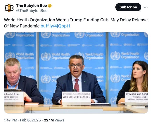Luckily, it appears that I have some time to do so given the recent shuttering of USAID which funded the Wuhan Lab and also funds the WHO, WEF, Gates’s Gavi Alliance, and Soros (injecting a little "Babylon Bee” satire here folks):