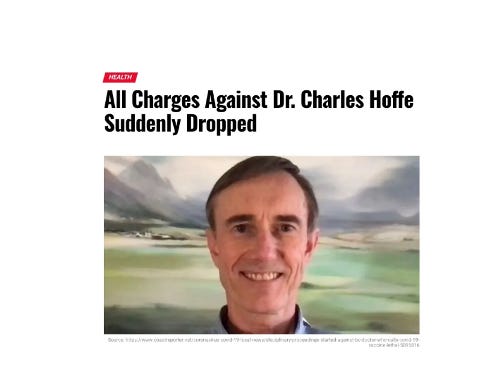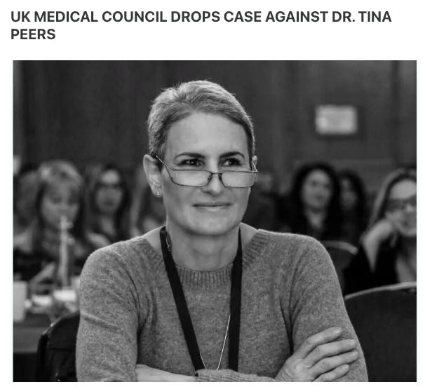 Also, lets not forget my dear friend and colleague in the UK, Dr. Tina Peers an outspoken physician who did early treatment for Covid and called early public attention to the harms of the vaccines. Her Medical Council accused her of misinformation and not comporting with standards of care etc. Her case was eventually dropped last September as well. Apparently, the Council did not have a desire for a public hearing where she was going to call up her vaccine injured patients to testify on her behalf.