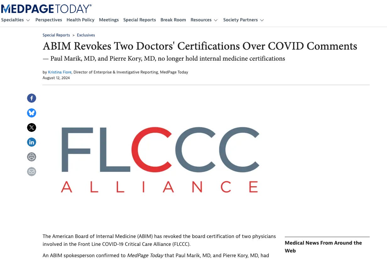 Further, my and Paul Marik’s own recent defenses against attacks by the American Board of Internal Medicine failed despite numerous appeals and eventually led to my Specialty Board Certifications being revoked, something that the “system” docs seemed to celebrate as this industry rag was quick to publicize:
