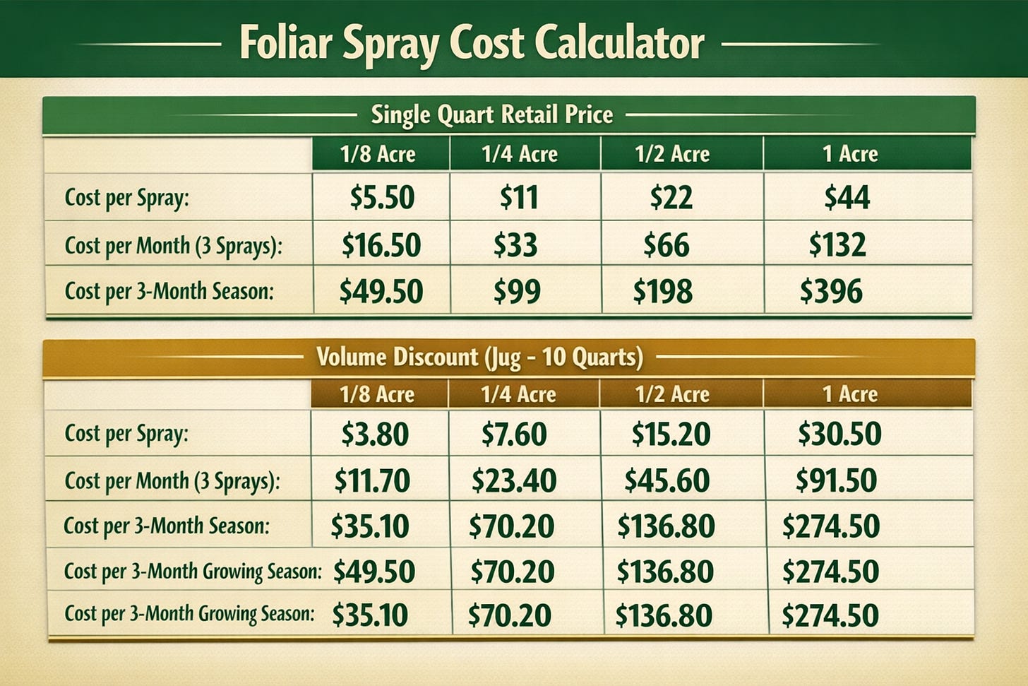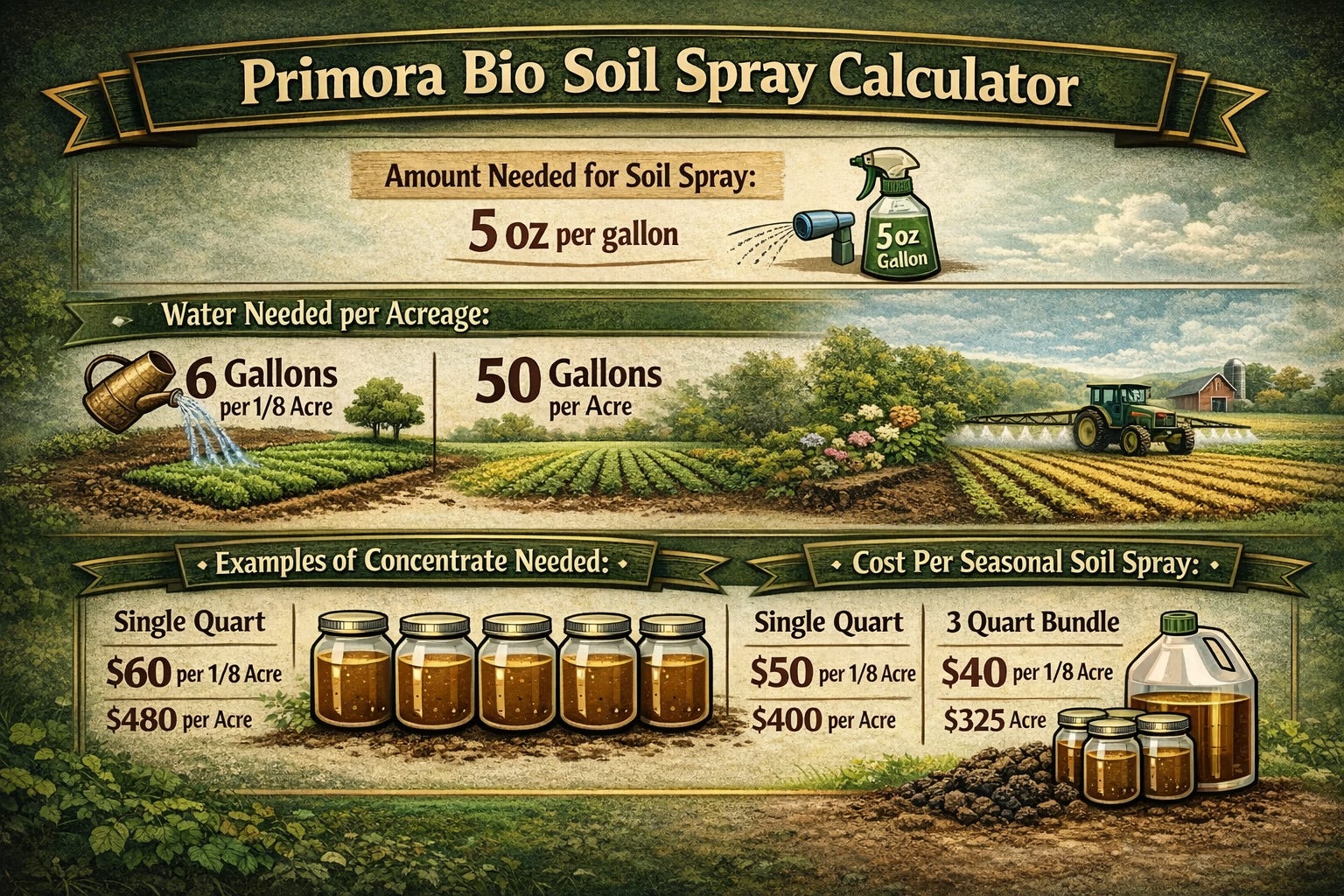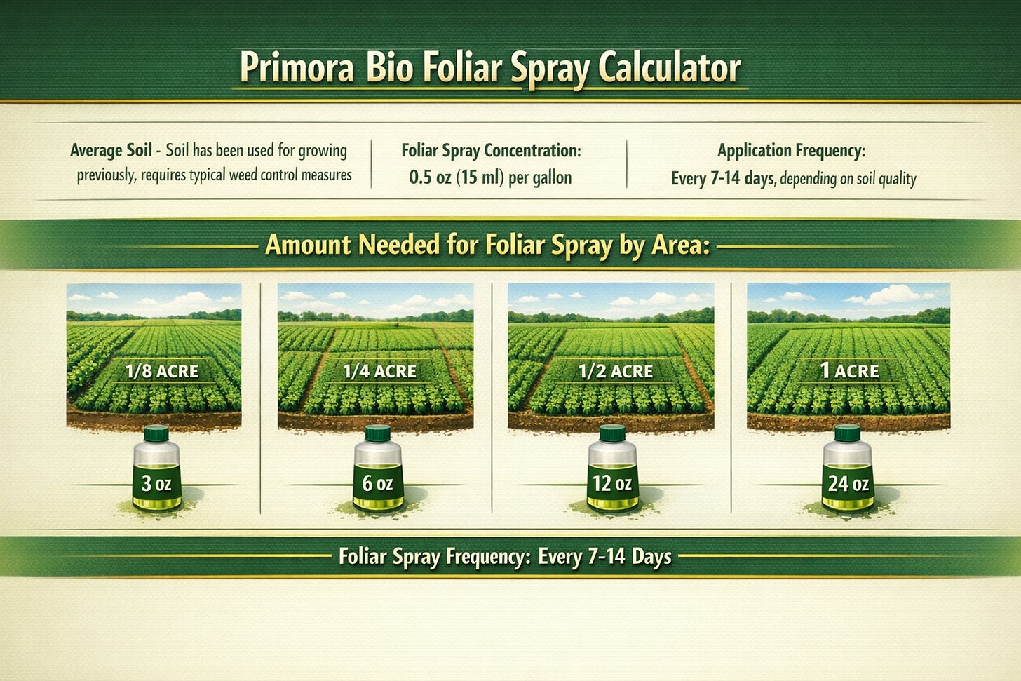 Calculate the recommended amount of Primora Bio for the volume of water estimated for the area of your plot, garden, or farm. Note: the amount needed for the seasonal soil spray is much more than used in weekly or biweekly foliar spraying.