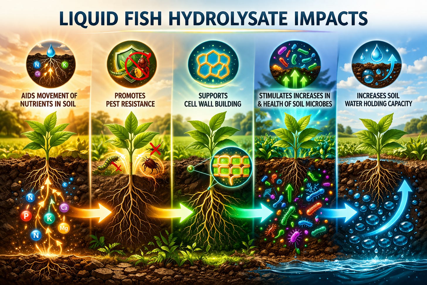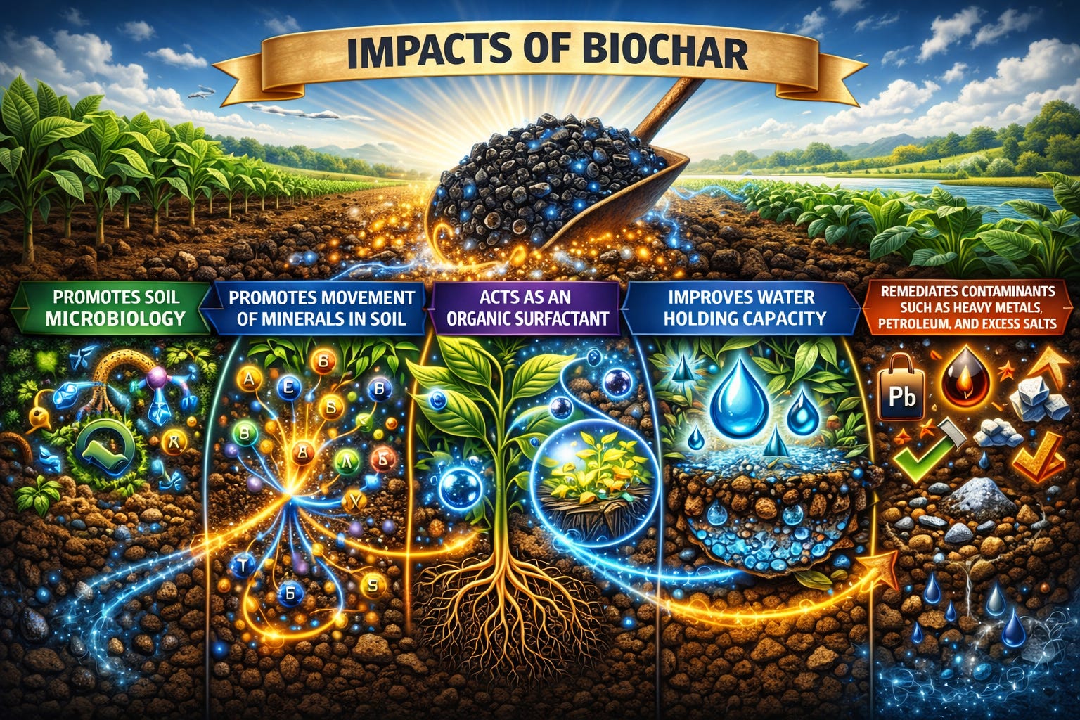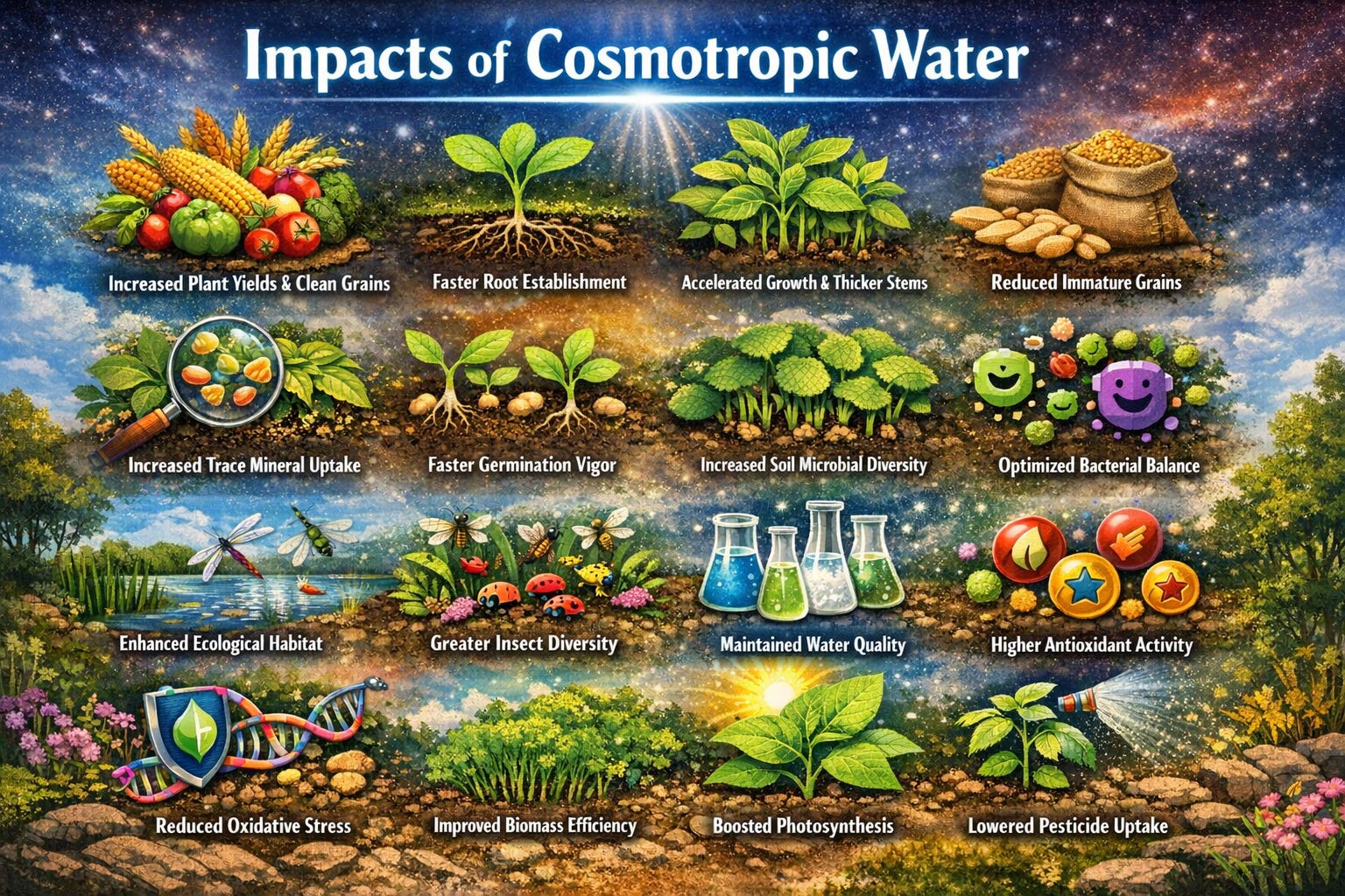 Water treated with a biotite-derived vermiculite mineral extract, a mineral composition with “multiplicative” properties, meaning the addition of small amounts acts on large volumes of water, rendering the water in a more electrochemically ordered state, which, across six studies in varied conditions and contexts, demonstrates changes in a multi-domain agricultural impact profile as per the AI-generated image below: