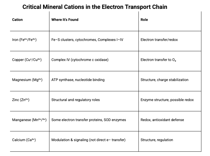 Thus, minerals play a foundational role in maintaining this system. Elements such as iron, sulfur, copper, magnesium, and zinc are required to build and stabilize the protein complexes that move electrons and pump protons. Without these minerals, the machinery breaks down: electron flow becomes unstable, and harmful free radicals form instead of useful energy.