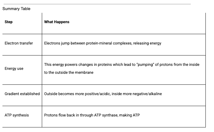 Again from earlier, during energy production in mitochondria (and in chloroplasts in plants), electrons are passed along a chain of carriers, releasing energy that is then used to pump protons across a membrane, forming a proton gradient.