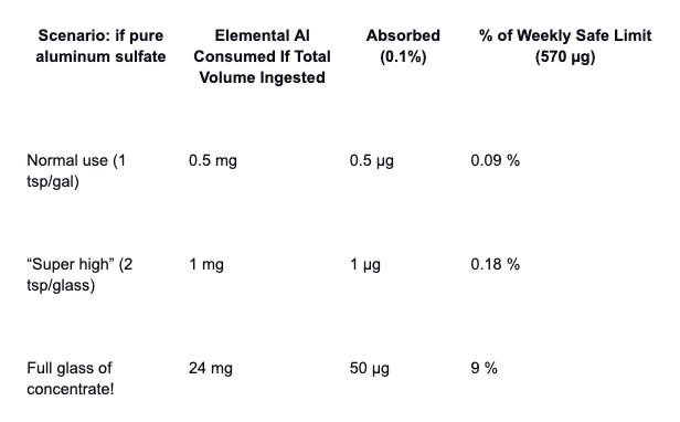 Even in the absurd “drink-the-concentrate” scenario of an imagined pure aluminum sulfate solution, absorption remains well below safety thresholds.