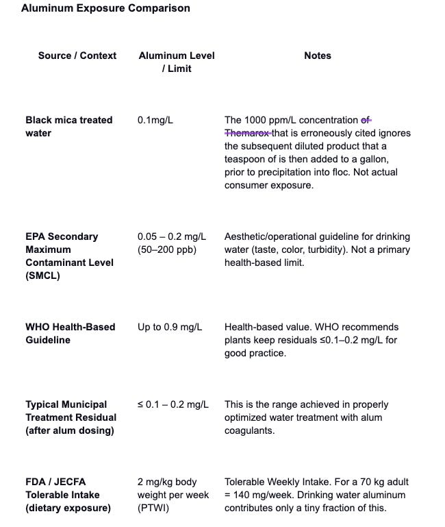 Themarox concentrate contains about 1,000 ppm aluminum—but no one drinks the concentrate. When properly diluted (1 teaspoon per gallon; ~1:1000 ratio), the resulting water has < 1 mg/L aluminum, and that is before flocculaion!.