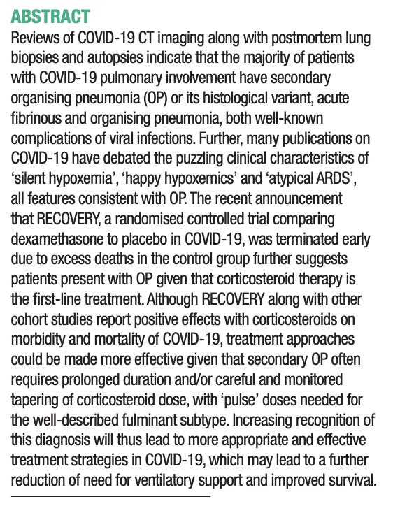 To wit, my first paper on Covid (and the one I am most proud of) was initially drafted in April of 2020. I argued then that Covid-19 pulmonary disease was not a viral pneumonia but instead an “organizing pneumonia” (a form of lung injury with many causes (viruses are only one of them) but whose mainstay of therapy is corticosteroids).