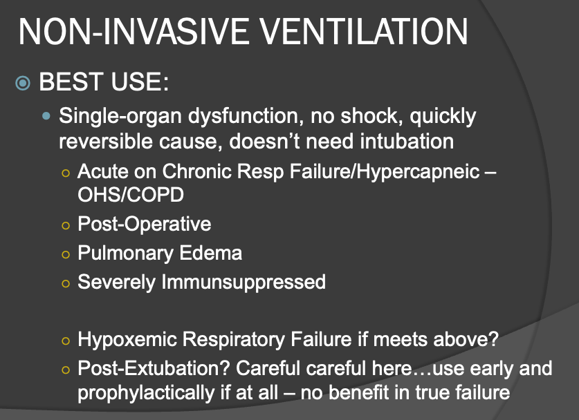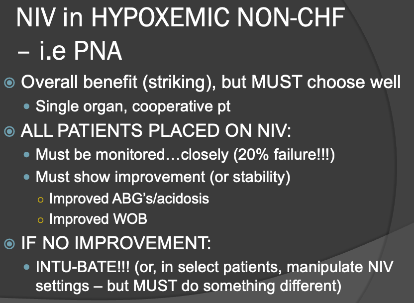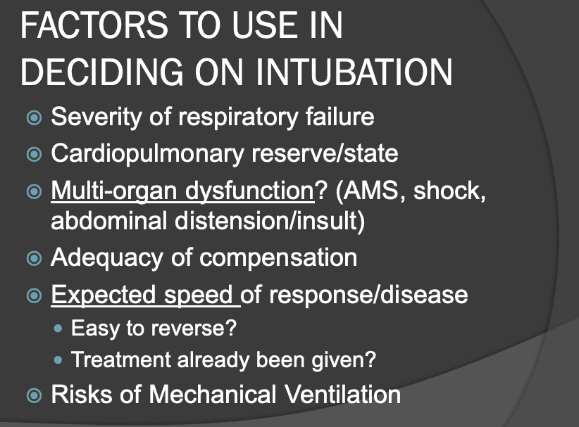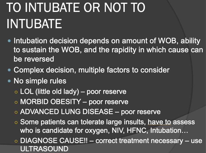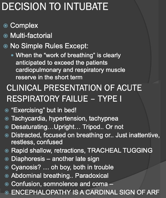 Since I suspect many of my readers are “geeks” like me, I decided to pull some slides from one of my old lectures on acute respiratory failure below. I think they cover all the factors that must be considered succinctly (sorry about all the acronyms, but if you want to decipher them as you go through the slides, they are; ARF: acute respiratory failure, NIV - non-invasive ventilation (BiPAP machines), CHF - congestive heart failure, PNA - pneumonia, HFNC - Heated high flow nasal cannula, WOB - work of breathing, AMS - altered mental status, OHS - obesity hypoventilation syndrome, ABG - arterial blood gas).