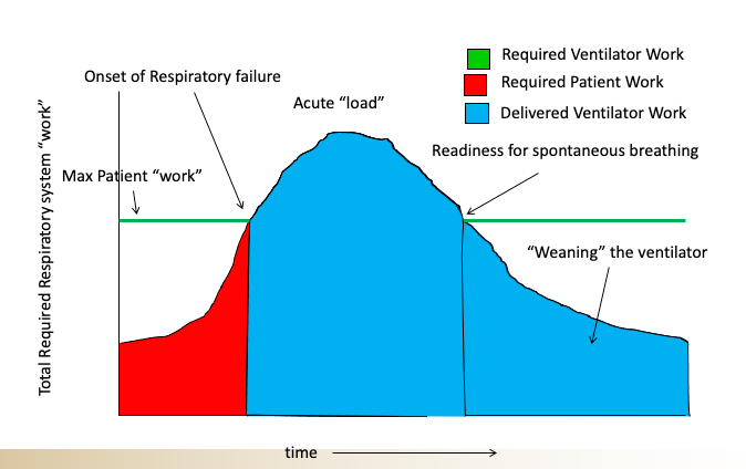This is where it gets a bit more complicated as a patient’s ability to sustain an elevated work of breathing is itself dependent on multiple factors such as their frailty (or conversely their strength), their mental status, and the cause of their respiratory failure (some conditions are more easily and quickly reversed than others). Here is a schematic that I would use to try to teach this concept to my students (made by my old colleague Nate Sandbo at UW.)