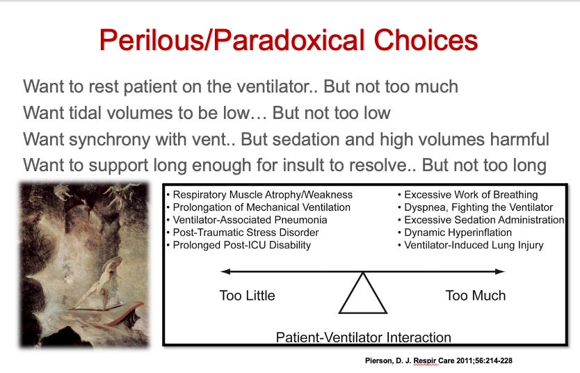 Although it is true that mechanical ventilation, when used inexpertly, can subtly and progressively worsen lung injury, I do not think this was a major factor. Respiratory therapists (who, in my opinion, really “run” the ventilators in most hospitals) generally follow protocols which avoid such harms. And thats an entire other rabbit hole which I won’t go down right now - meaning that although RT’s follow safe protocols, they generally do not have the facility, expertise, or insight to know when a non-protocolized approach is optimal for a patient, something I have tried to teach them my entire career.
