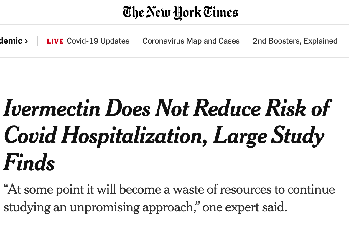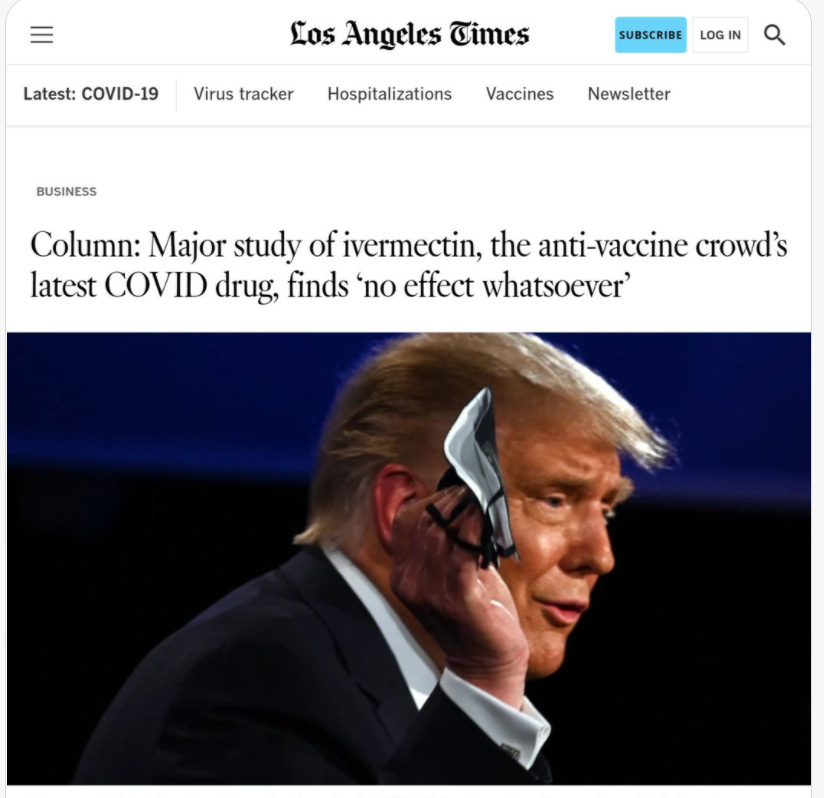 The LA Times propaganda even uses Trump! Masterful really. Note that sufficient ivermectin trials data emerged well after Trump stopped caring or talking about COVID given he was solely focused on the election in the fall of 2020 and I don’t believe he never mentioned ivermectin before leaving office (although I have a highly reliable and connected source who informed me that then-President Trump was treated with ivermectin when he was sick with COVID).