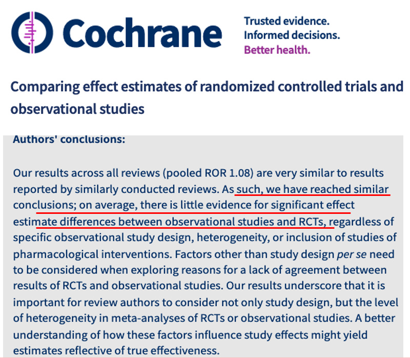 Fallacy #1: Results from retrospective observational controlled trial results.. cannot be trusted to guide policy. This is tragically false. The data actually show that OCT’s reach the same conclusions as prospective RCT’s, on average, in almost all cases (except in the cases of HCQ and IVM not-so-curiously). This fallacy of RCT dominance was long ago disproven in a comprehensive Cochrane Library review as well as in this policy paper by the American Thoracic Society among many other reviews. Yet this theory continues to be propagated and practiced widely by national and international health agencies, with the encouragement of Big Pharma. This is why Senator Ron Johnson boldly decided to hold his historic hearings in May and December of 2020 and more recently in his COVID-19: A Second Opinion expert panel. He did this to allow the public to directly hear from COVID experts without conflicts of interest bring forth real world scientific data without the corruptive filter of the journals and the agencies and the overwhelming dominance of Pharma funded RCT’s. Yet the agencies continue to ignore such data despite the U.S CURES act of 2016 which mandated they do so. Regulatory capture on full display. Maybe the below “inconvenient” paper is why BMGF decided to start donating to Cochrane?