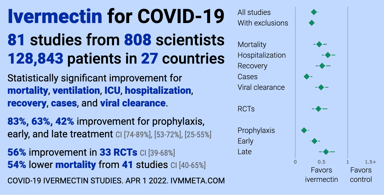 “On their second review, Dr. Hill and his colleagues focused on the studies least likely to be biased. In that stricter survey, ivermectin’s benefit vanished. Still, even the best studies on ivermectin and Covid were small, with a few hundred volunteers at most. Small studies can be vulnerable to statistical flukes that suggest positive effects where none actually exist (I would actually agree with this in regards to a single or just a few small studies.. but from 81 of them). But larger studies on ivermectin were underway at the time, and those promised to be more rigorous.”