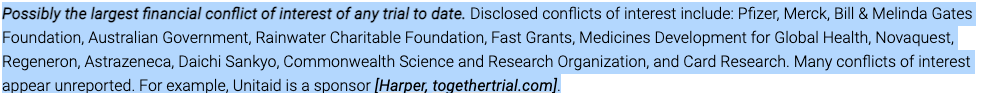 Some of my colleagues might disagree or feel premature regarding my diagnosis of fraud in regards to this trial. Whatever. The study investigators have not only carried out a series of severely biased and duplicitous actions with deliberately withheld data such that fraud at this level, in my mind, is definite. But let’s say, for argument’s sake, that it is instead just a severely biased trial by severely biased and financially conflicted researchers whose careers are dependent on contracts from massively powerful agencies and corporations whose interests are decidedly anti-ivermectin - see this description of the trial by the impressively expert C19early.com group: