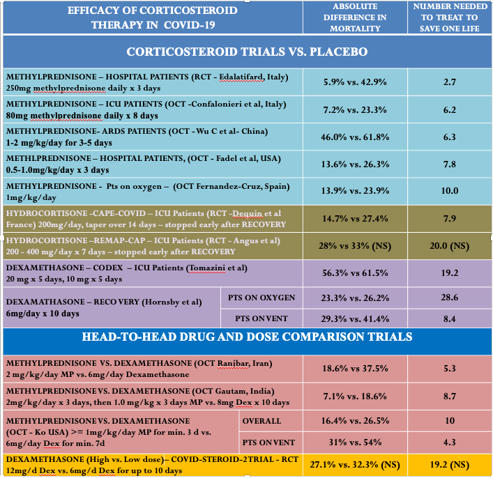 I/we in the FLCCC got lucky when I was invited to testify in the U.S Senate by the Senator from Wisconsin, Ron Johnson, who chaired the Senate Committee on Homeland Security & Governmental Affairs. He decided to hold hearings as to why, in my words (and likely his too) “the doctors were not doctoring” and U.S citizens were effectively being denied treatments or attempts at treatment. Spot on really. I got the invitation because he had found the FLCCC website and protocols and noticed that one of the founders was from Wisconsin so I immediately received a phone call and invitation. Watching it again, a year and half later, I was struck about how much we knew back then about how to treat the disease and how strongly we made the argument for corticosteroids. Months before all the randomized trials (RCT). Furhter, I must point out that I every element of our protocols was incorporated many months before later having been proven in an RCT. With corticosteroids, it was not until late June 2020, when a press release announced from across the pond, that Oxford University’s RECOVERY trial, testing 6mg of dexamethasone daily, had found a small, but statistically significant reduction in mortality when used in patients on oxygen and an even larger one in patients on mechanical ventilation.