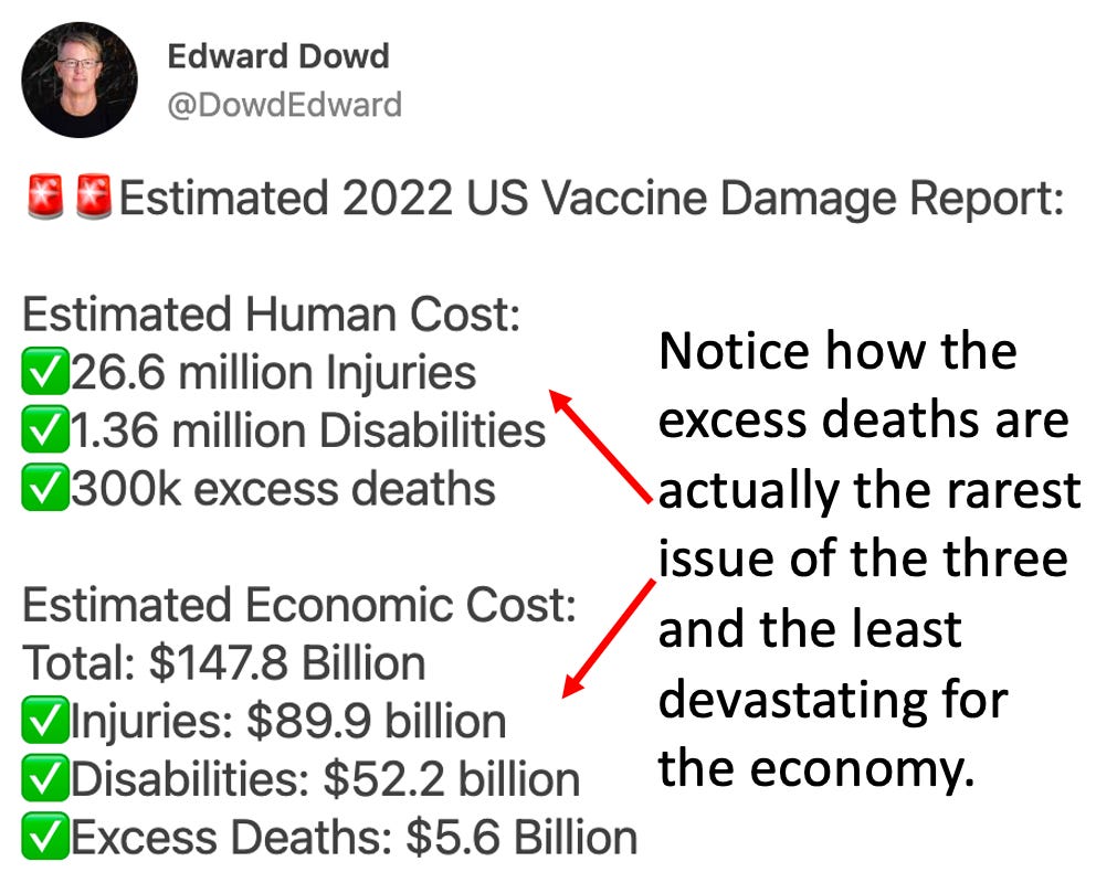 Now, let’s consider the case of the COVID-19 vaccines—they have caused a large number of people to die suddenly, including young athletes, which is such a distinctive and catastrophic event that the general public is beginning to recognize it, and no amount of propaganda can close their eyes. However, the vaccinated dead are not the only victims, and Ed Dowd’s team has done a lot of work to try to quantify the magnitude of the issue our country is facing: