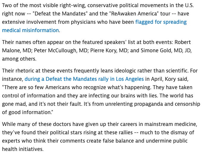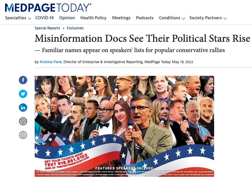 Funny thing is, the day before I published my Op-Ed, I got attacked in a hit piece as some sort of “Right-Wing Rising Star”. What? It was published in the Pharma rag called MedPage Today (it hits the daily inbox of many doctors in the country). Me, Paul Marik, and the FLCCC have long been their punching bags. They even led off with a quote of mine which they essentially characterized as “dangerous ideology.” I happened to have made that statement at the Defeat the Mandates Rally in LA last month, solely as my deeply studied assessment on the the media and medical sciences over the last 2 years. It was not a judgement.. it was an observation. I love how they said that many of us docs “have given up our careers in mainstream medicine.” It wasn’t voluntary ya shmucks, but then again, you knew that.