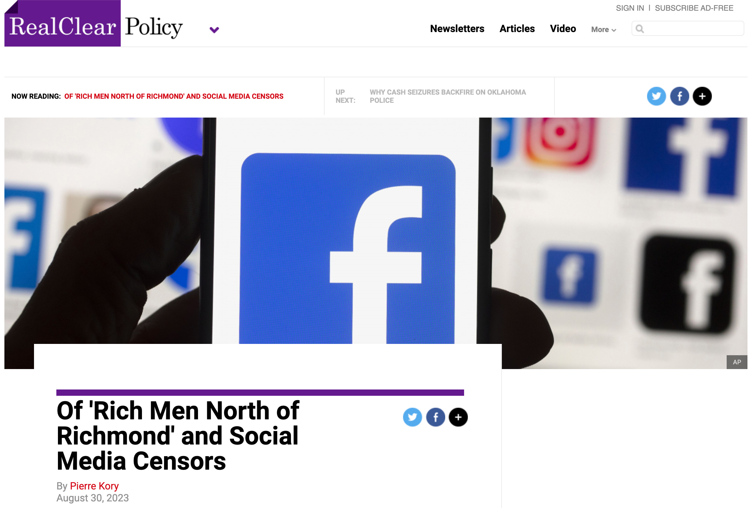 I landed the Op-Ed in RealClear Policy, detailing the pernicious practice of widespread censorship by our government which is subverting the independent exchange of information and ideas.