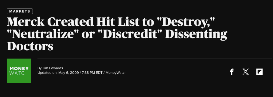 Merck also attacked doctors trying to call attention to that fact, another Disinformation tactic called “The Blitz”).