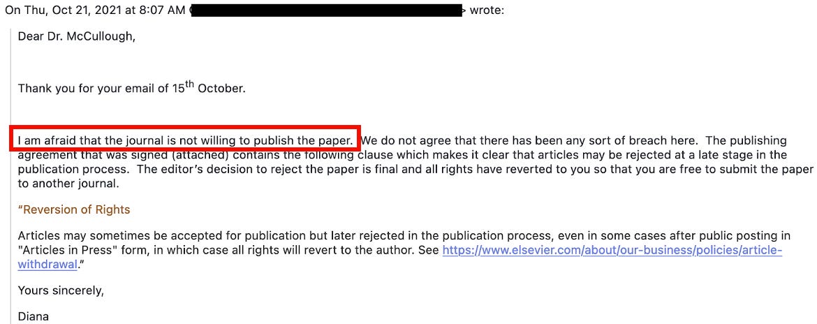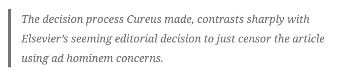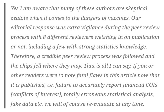 This editor literally called out other journals for censoring their work solely based on the supposedly negative (“anti-vax”) reputations of some of the authors (e.g. ad-hominem attacks). However, despite that one editor’s original supportive answer, the journal quickly backtracked and retracted the paper based on a list of easily disprovable “concerns.” Retraction Watch also published a review of the case here.
