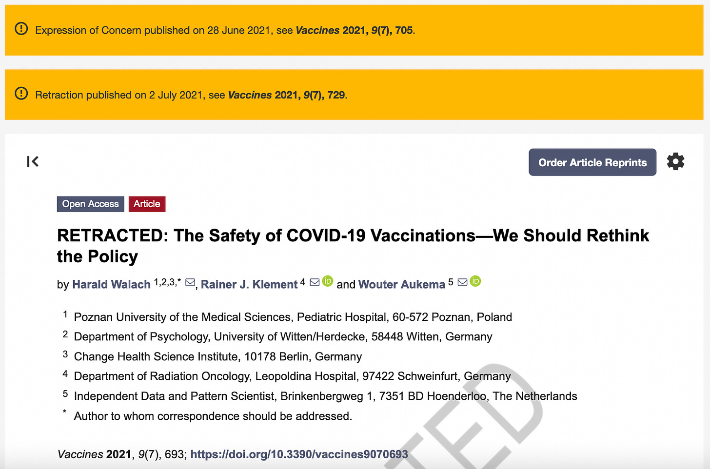 Another memorable retractions was the below paper by Walach et al., ‘The Safety of COVID-19 Vaccinations- We should Rethink the Policy.’ The main finding of the paper found: “For three deaths prevented by vaccination we have to accept two inflicted by vaccination.” Following its 24 June 2021 publication in Vaccines, several of the editors of the journal resigned in protest.