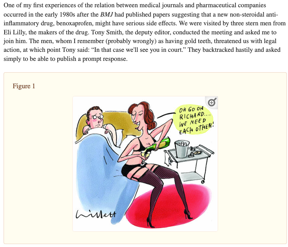 Ultimately, all that Pharma money undoubtedly leads to… Editorial control. One example was published by the former Editor of one of the top journals in the world, the British Medical Journal (BMJ), where he includes this anecdote and cartoon:
