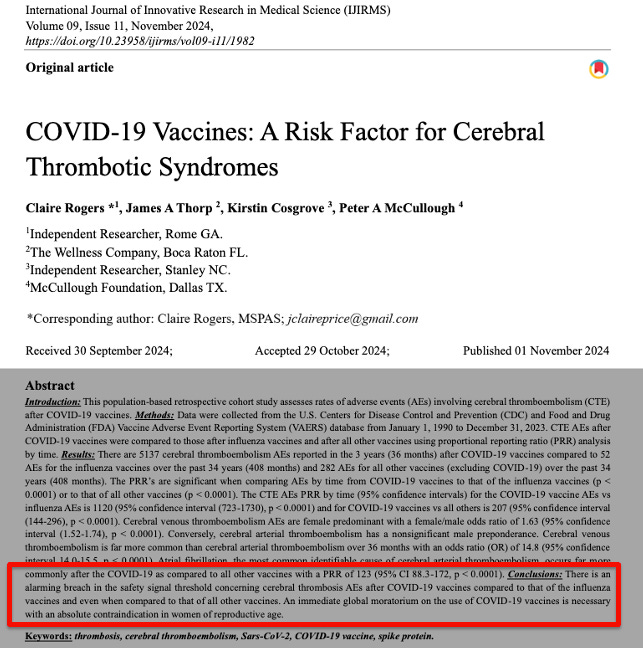Although it is impressive that such a damning paper against the safety of the Covid-19 vaccines was published, two caveats are that; 1) it was literally just published (Nov. 24) so there has been little time to mobilize against it yet and 2) it was published in a journal that I have never heard of before.