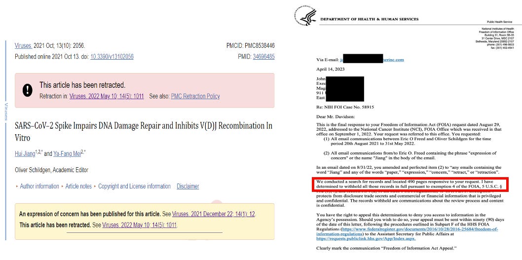 Another retraction was this paper by Jiang and Mei in Viruses where they found that spike protein (what the mRNA encodes for) impairs DNA damage repair in vitro. The NIH illegally redacted (not retracted) all 490 pages regarding discussions of the paper. It goes deep folks: