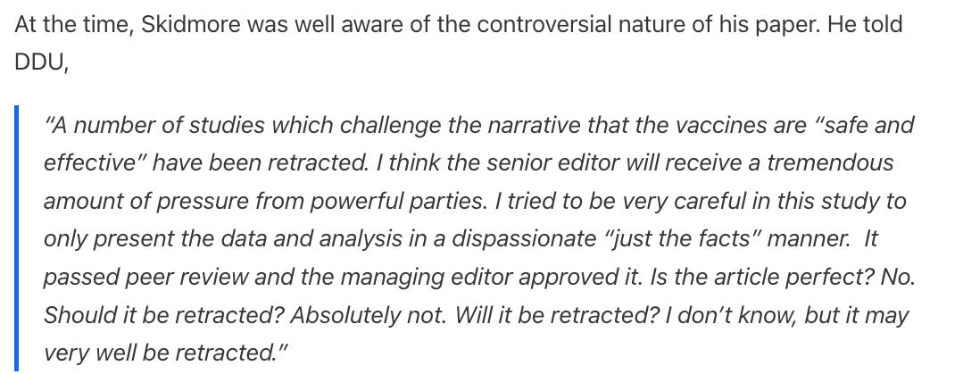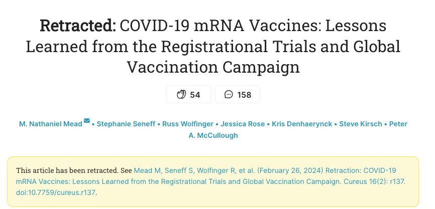 Know that the stories behind each retraction are nearly identical to my own with ivermectin above. Essentially, a paper with data and/or analysis which concludes grave harms from the mRNA jabs gets submitted, passes peer review, and soon after publication, the editorial team concocts some story of “concerns” with the analysis and retracts it.