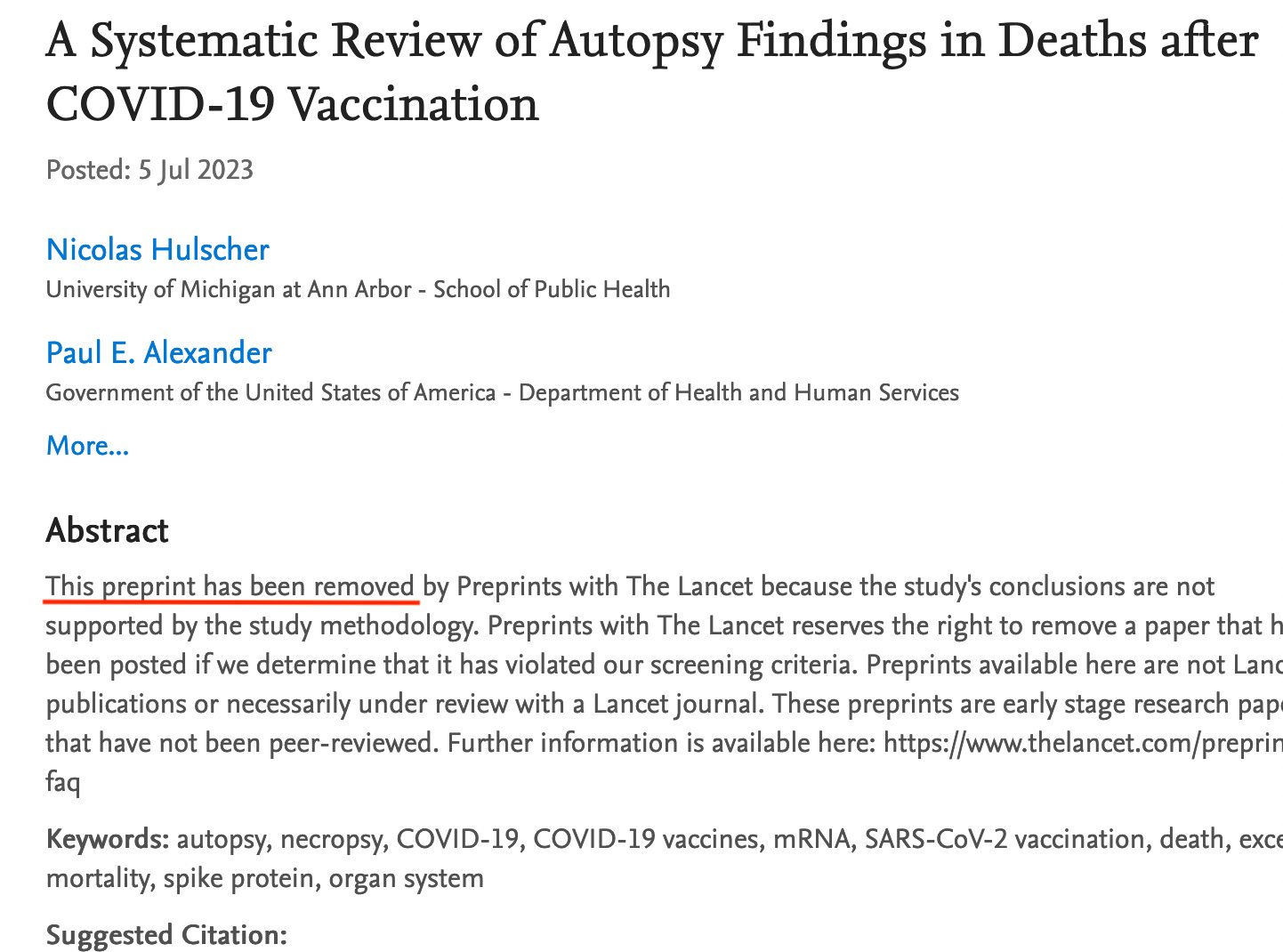 He tells the story of several papers that have been unfairly retracted in violation of retraction guidelines. One paper he highlighted was his own which was titled “A Systematic Review of Autopsy Findings in Deaths after COVID-19 Vaccination.” It was removed from The Lancet’s preprint server, probably because of its conclusion: “A total of 240 deaths (73.9%) were independently adjudicated as directly due to or significantly contributed to by COVID-19 vaccination.”