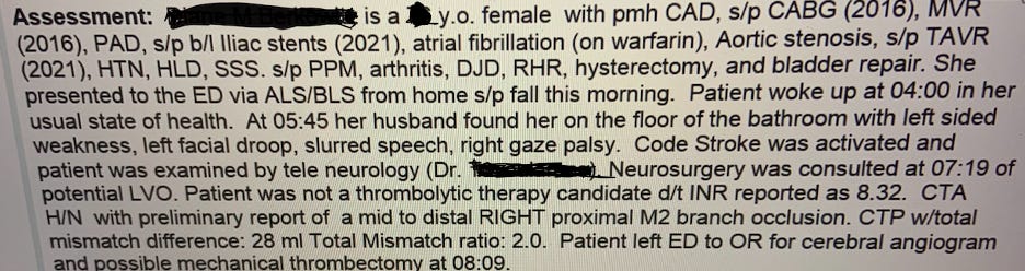 And then there is this doozy - another nurse sent me a case history below of an elderly woman whose blood thinner was highly “supra-therapeutic” (i.e. very thin blood at risk of major bleeding), yet she had a massive stroke caused by a blood clot. This simply does not happen.