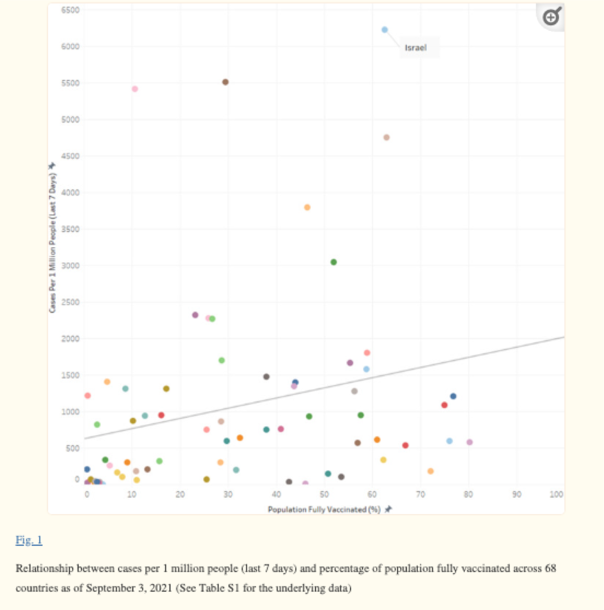 In this peer-reviewed paper they found that at the country-level (and U.S county level), there appears to be no discernable relationship between the percentage of the population fully vaccinated and new COVID-19 cases as seen below. In fact, the rising slope of the relationship in both graphs below suggest that mass vaccination policies may paradoxically lead to more cases, with Israel serving as a worrying outlier.
