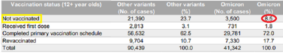 The respected Robert Koch Institute reported that among the 4,206 Germans infected with Omicron for whom their vaccination status was known, 95.58% were fully vaccinated. More than a quarter of them had booster shots. Given that the overall background rate for vaccination in Germany is 70%, this suggests an -87% effectiveness rate against Omicron.