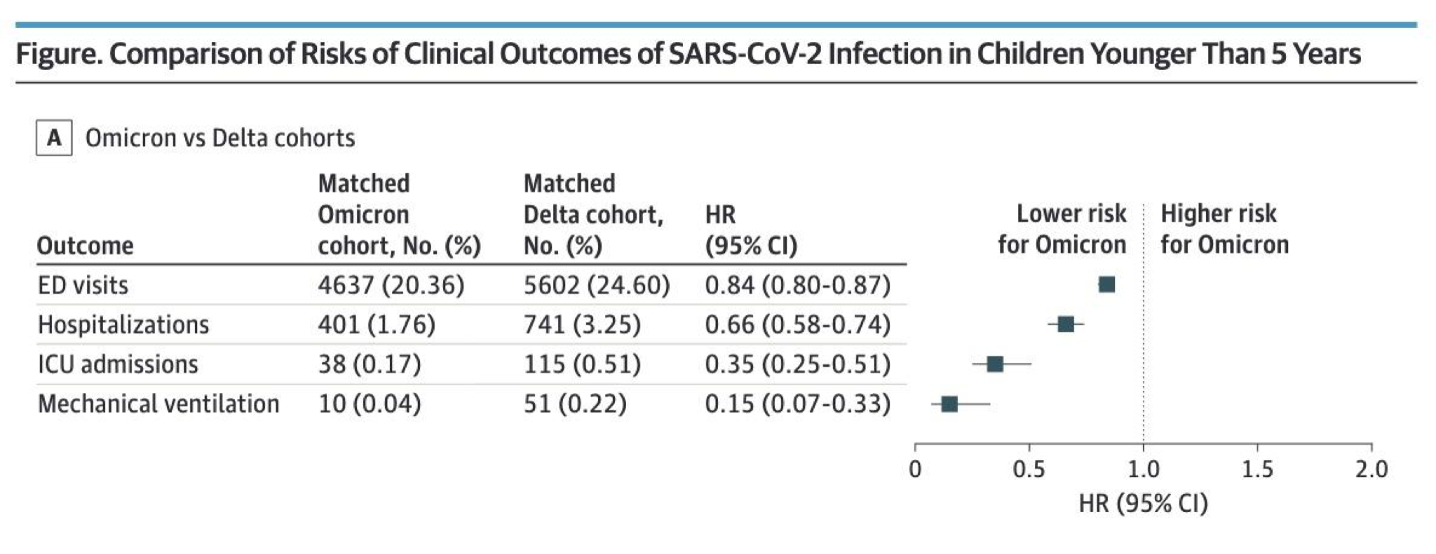 Strong evidence that newer variants of COVID-19 (Omicron) pose dramatically reduced risks to young children was published in the April 1, 2022, JAMA Pediatrics by Wang et al. Using a huge US medical database, they were able to match children aged under 5 who were infected with an Omicron variant with those who were infected with a Delta variant. Children with Omicron were only 35% as likely to require an ICU admission and only 15% as likely to require mechanical ventilation as same-aged children who had been sick due to earlier delta variants.