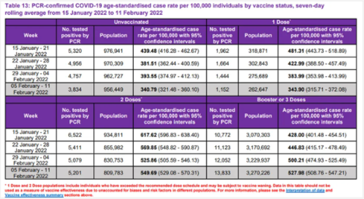 According to the latest U.K. health surveillance report, roughly 95% of those over 70 are double-vaccinated and about 90%-93% of the age cohorts over 70 are boosted. Just 1.6% of the senior cases between weeks 7 and 10 of this year were among the unvaccinated, which is below the 5% share of the population they compose. The triple-boosted actually made up 90% of the cases.