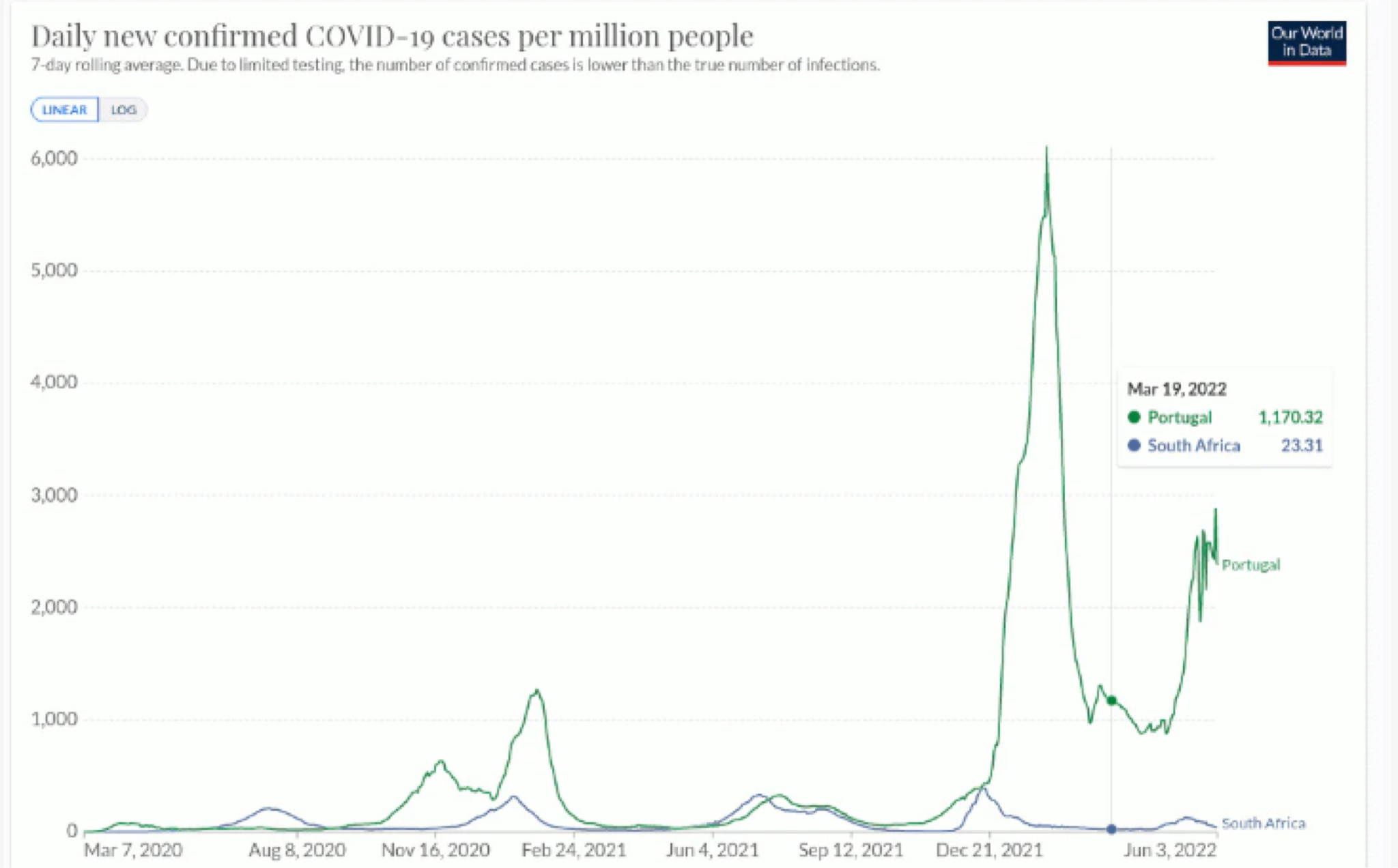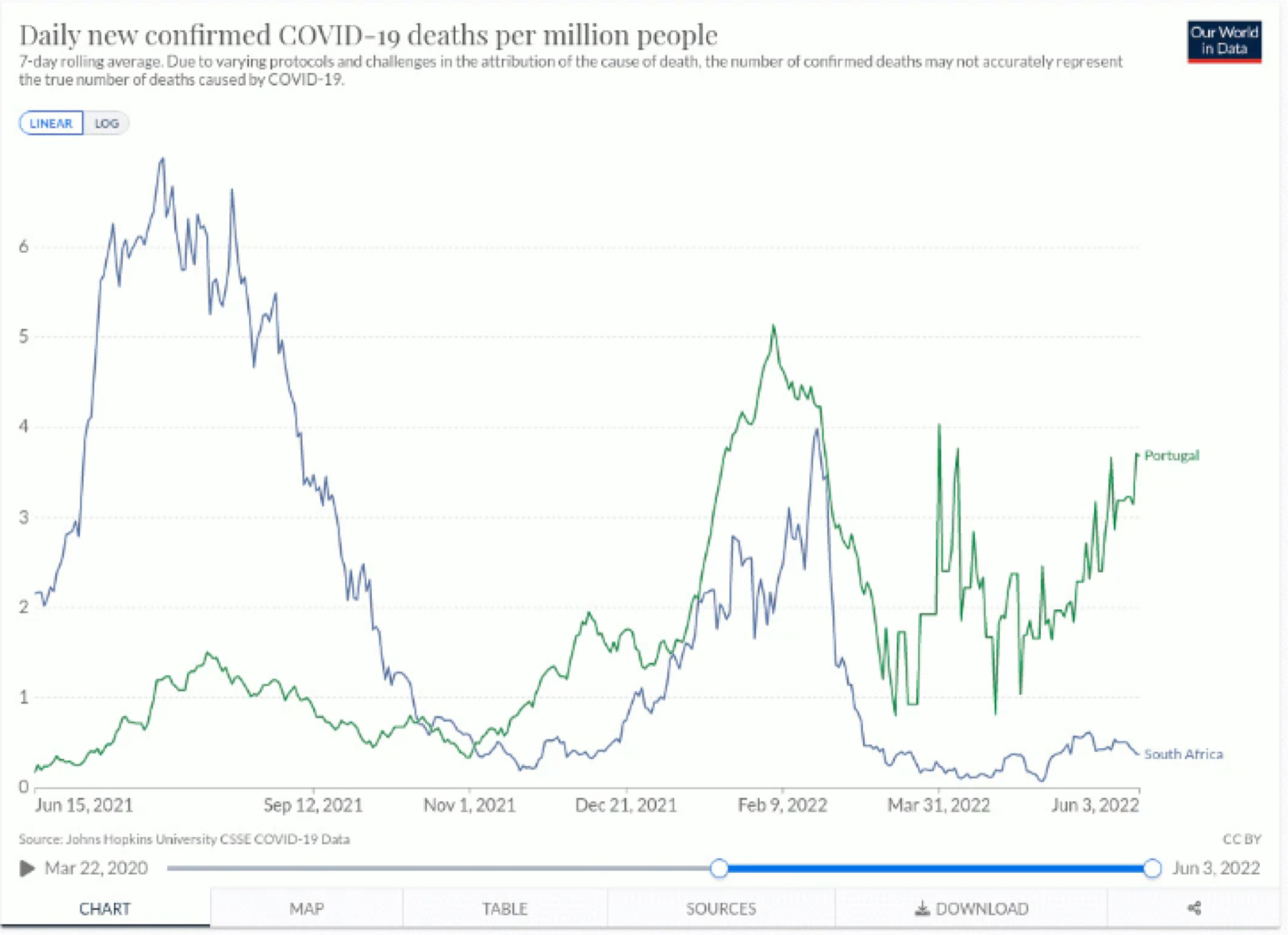 The implications of the vaccine’s diminished ability to protect against severe disease among more recent variants is now playing out in real-time. On June 5th, 2022, analyst Igor Chudov posted a 2 country comparison of the current cases and deaths being reported from Portugal and S. Africa, two countries undergoing similar waves of infection from the emerging B4/5 sister variants. South Africa is only 35% vaccinated and 5% boosted whereas Portugal is 95% vaccinated and 70% boosted. These variants are now driving a deadly wave of COVID-19 in highly vaccinated Portugal, with deaths among the Portuguese nearing their January peak and still rising as seen below.