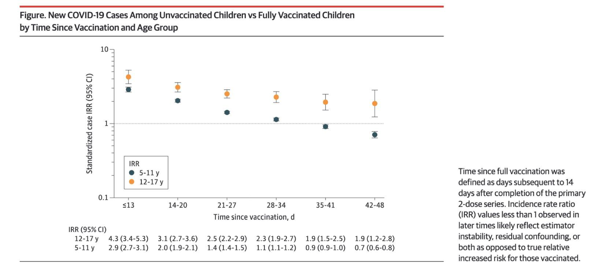 Some of the evidence for negative efficacy comes from booster data, which have fleeting efficacy, as one data point the fact that the Pfizer shots in the 5-11 year range led to very poor efficacy; 31% according to the CDC and 12% after 7 weeks according to a massive database comprising over 1.3 million children (365,000 of whom were vaccinated) from the NY Department of Health. Five to 11-year-old children dropped into the negative efficacy range by 8 weeks after receiving the second dose. See Figure below.