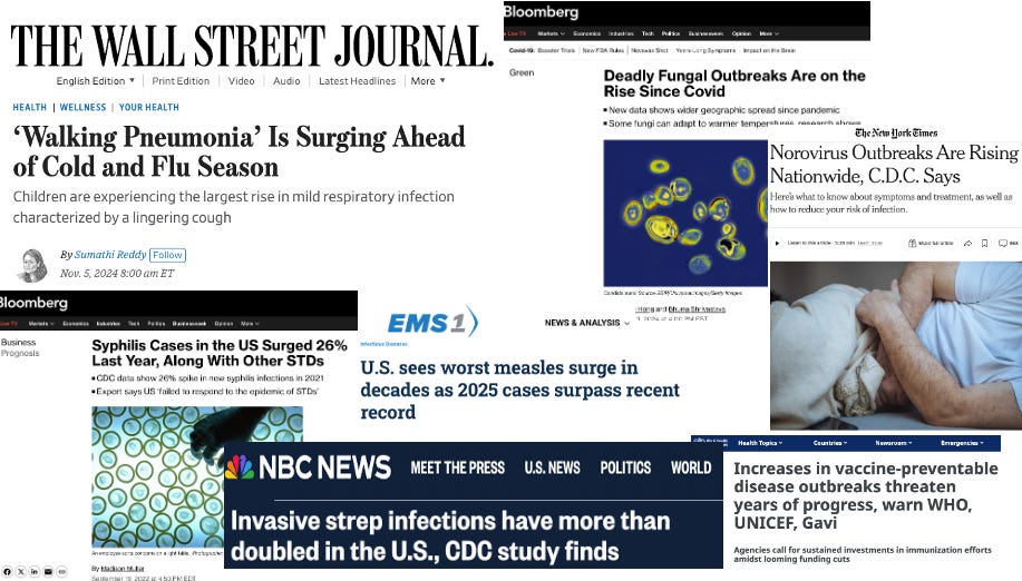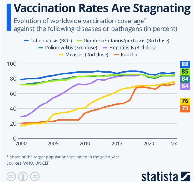 Here is my take: the “dropping vaccination rates” argument could certainly hold water, except two data points would have to be overlooked: 1) why would non-vaccine preventable diseases be rising at similar or even greater rates, and 2) why would the spikes of illness be so large compared to the tiny decreases in global vaccination rates? See this chart, which shows that, contradicting this argument, the measles vaccination rate was 76% in 2024, up from 71% in 2019, and as for polio and TB, they are only down by 2% compared to pre-pandemic: