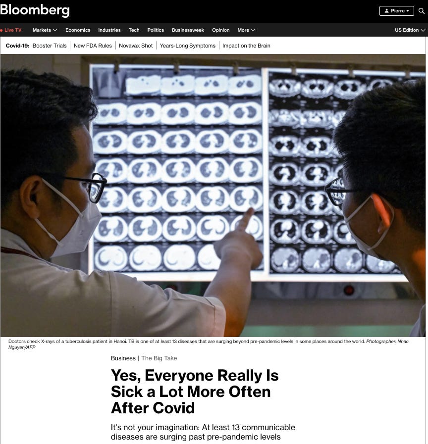 So, in the above list of “differential diagnoses” generated to explain the surges in illness, the Bloomberg journalists never entertained the possibility that the negative immunological consequences of mass vaccination with an experimental gene technology might be a cause. Oddly, they didn’t even explore the less politically charged (and much more obvious) possibility that patients who recover from Covid-19 itself can exhibit alterations in immune function.