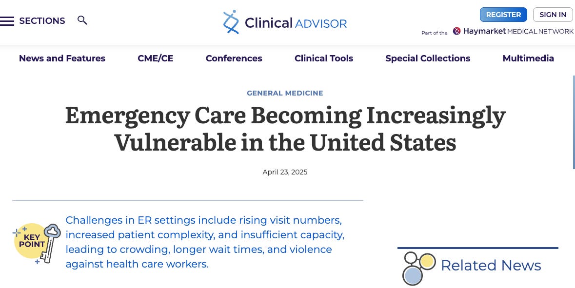 “A consistent increase in visit numbers from 2020 to 2024; increased patient complexity (both complex medical and social needs); increased patient acuity; and insufficient capacity, which can lead to crowding, longer wait times, and violence toward emergency department staff. Additionally, payment to physicians per emergency department visit is falling.