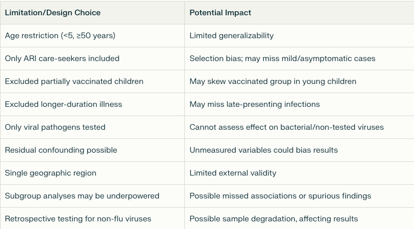 “While Sundaram et al. provides valuable evidence, its conclusions are limited by age restrictions, selection bias toward care-seeking individuals, exclusion of certain groups, limited pathogen testing, possible residual confounding, and single-region data. These factors should be considered when interpreting the study’s findings.” Ed: Ya don’t say.