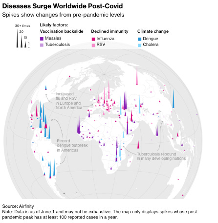 This post was triggered by the above Bloomberg News article from last year - it has been sitting in my drafts for a while so forgive me. The article’s global “spike map” of infectious disease surges post-COVID caught my attention—not only for what it included, but for what it left out. Let’s break down the data, the explanations offered, and the “elephant in the room,” i.e the mRNA campaign’s effects on global immunity.