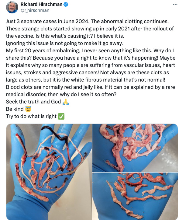 Also see this Substack by Laura Kasner showing numerous clots removed from living people in cardiac and interventional radiology catheterization suites (“cath labs”).