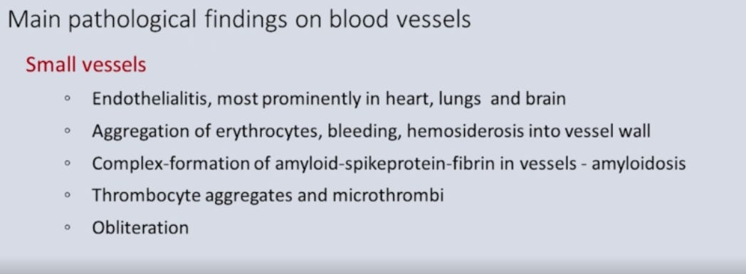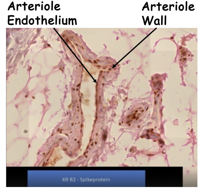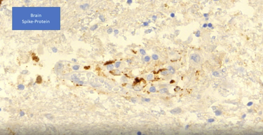 He also shows a slide of the brain in one dead patient. Again, spike protein infiltration. No wonder all my patients have brain fog.