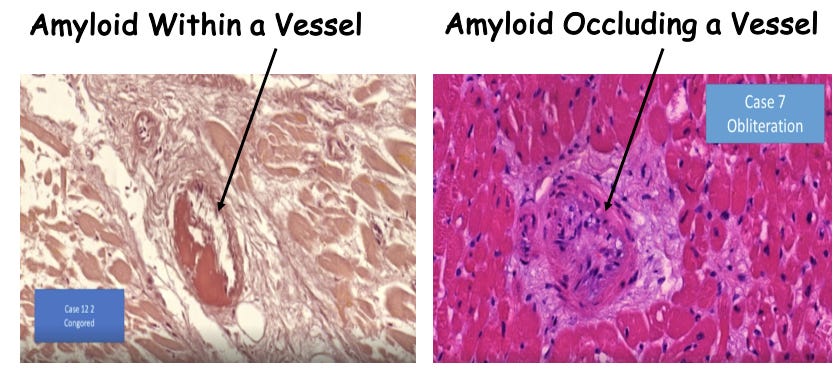 Sure enough, Dr. Burkhart shows numerous examples of amyloid lining and filling vessels and vessel walls (note pathologists have a special stain for amyloid called Congo Red which makes it very distinctive and easy to identify).