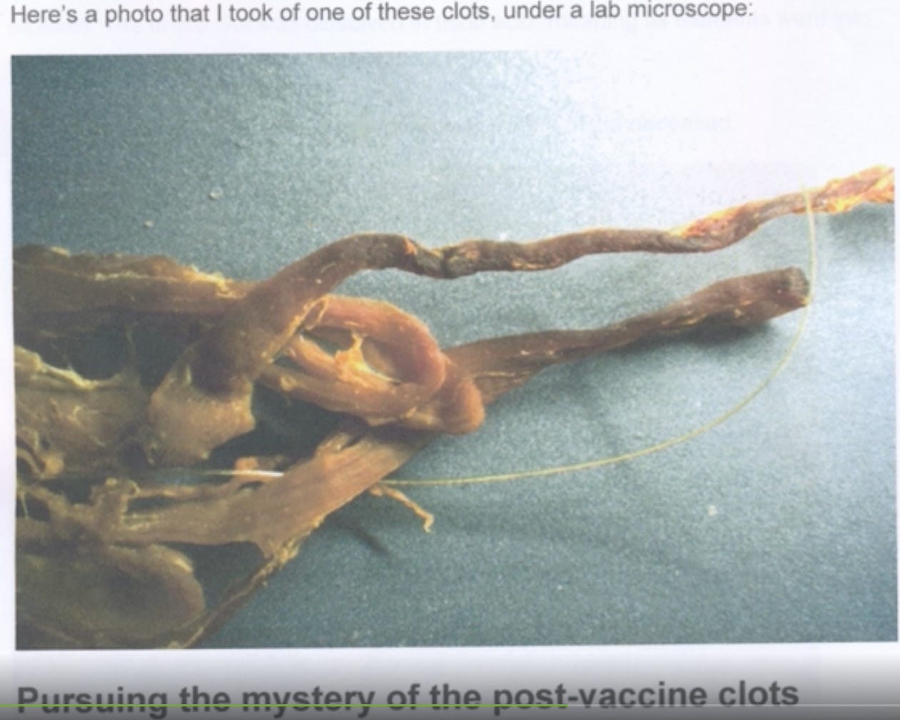 They also examined one of the nasty “fibrous white clots” that have been extensively reported on by embalmers and funeral home directors that started showing in early 2021 after the rollout of the vaccine campaign.
