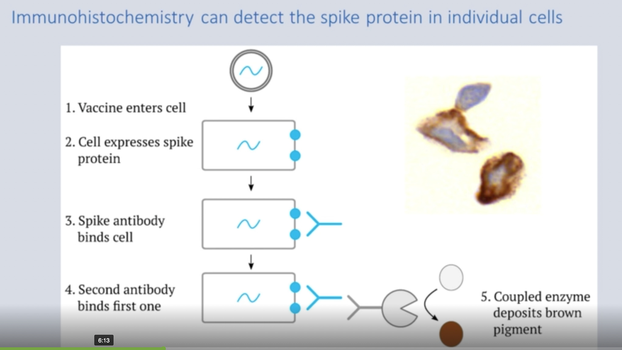 The spike protein stain they created works as depicted below. Basically, once a cell takes up the mRNA and begins expressing spike protein on its surface, our immune cells produce antibodies that attach to the spike protein (given it is a supposedly foreign protein). The stain is made up of an antibody that attaches to our own spike antibody and it has an enzyme which causes the deposit of a brown pigment when it attaches.