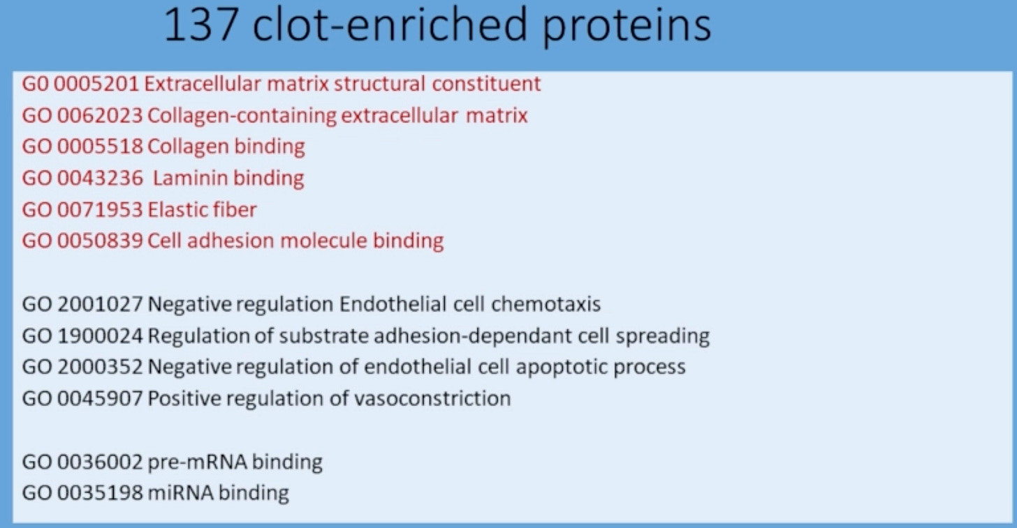 They then used a technique called mass spectrometry which enabled them to identify 137 different proteins in the clot that were not present in the serum! The ones listed in red below are components of the endothelium, revealing evidence of destruction to the vessel walls. “Continuous damage to the endothelium.”