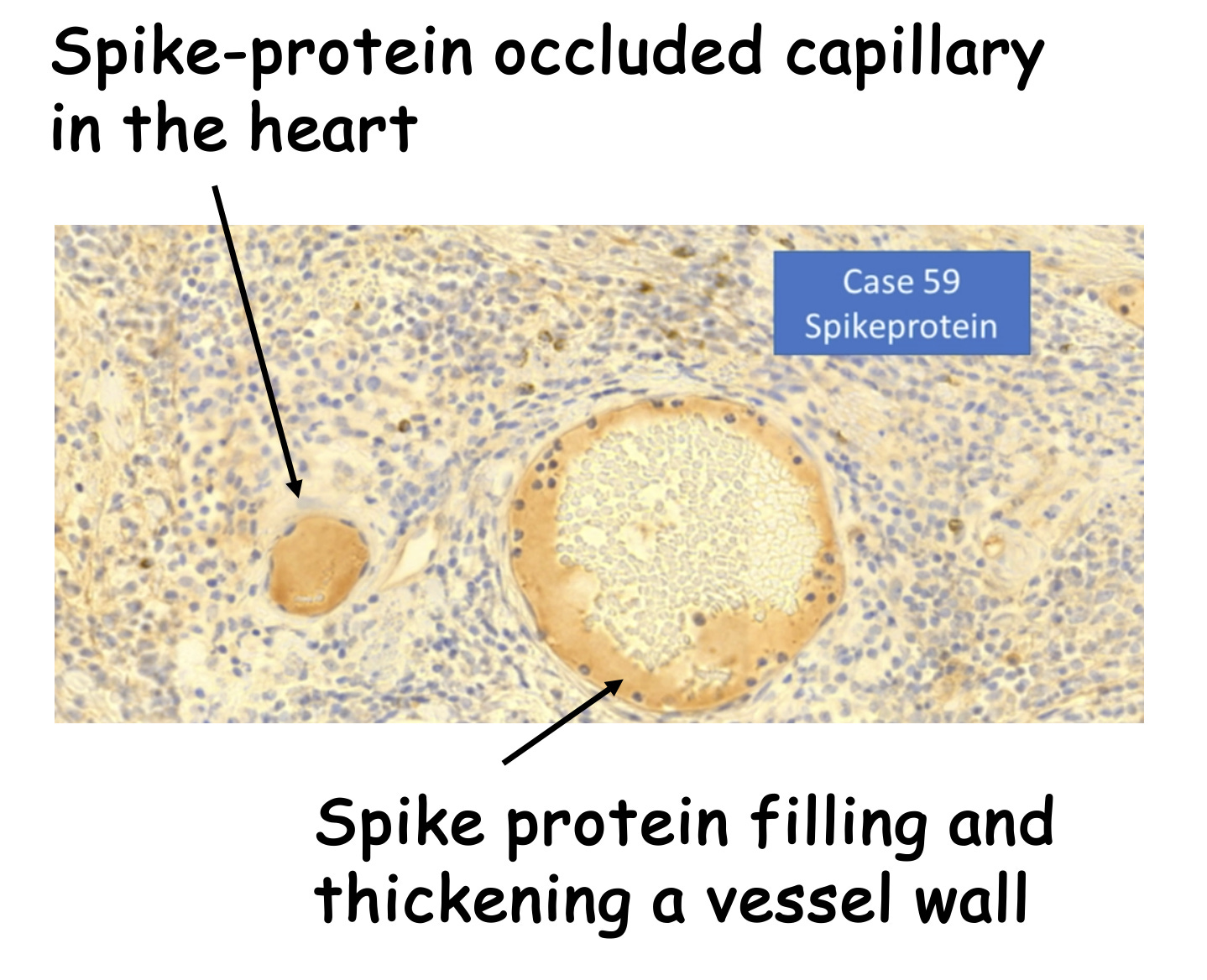 Below he shows evidence of spike protein both occluding and narrowing vessels in the heart: